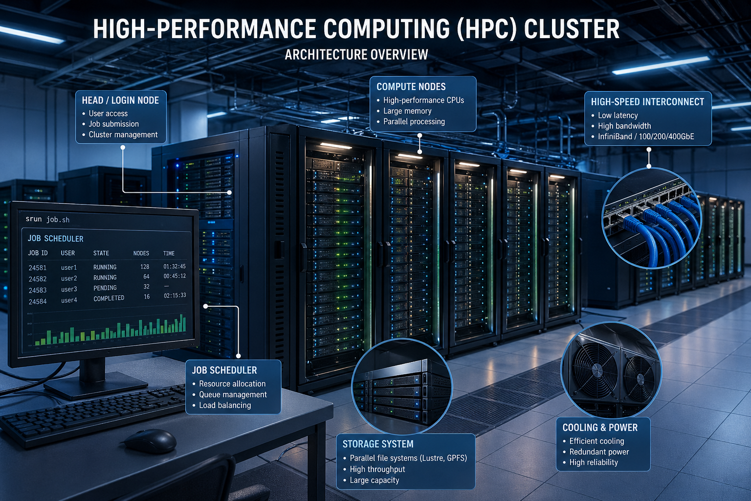 Modern High Performance Computing (HPC) architecture is built around three core layers that work together to deliver extreme computational power: